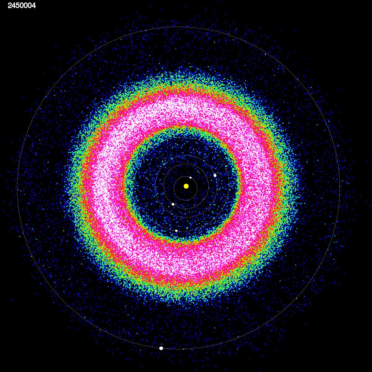 Not Much To say really, just some movies I made in my spare time plotting the density of known asteroids in the solar system. The data was taken from the astorb.dat catalogue, and uses the orbits of over 280,000 objects. The movies essentially show the addition of objects from the file, at first slowly but accelerating over time (if I added one per frame it would take over 3 hours to run!). I've not made any effort to map this to real dates, but the number of objects is on every frame so you can make a guess from that.
