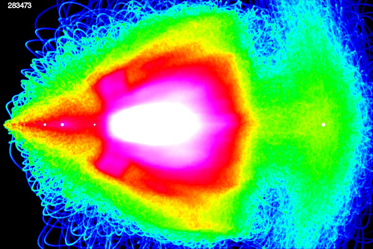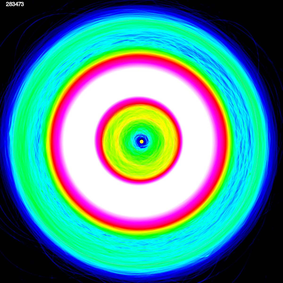 The plots show densities mapped in false colour, with a logarithmic scale so we can fit the full range of densities in a somewhat meaniful fashion. There are 2 versions of each movie, one has the density scale normalised to the peak density in each frame, the second has the density normalised to the peak density in the final frame. Two different mappings are displayed, one is a simple projection of the ecliptic, essentially looking down on the orbit of the planets, the other is a toroidal mapping which maps distance from the sun horizintally and altitude above the ecliptic vertically.